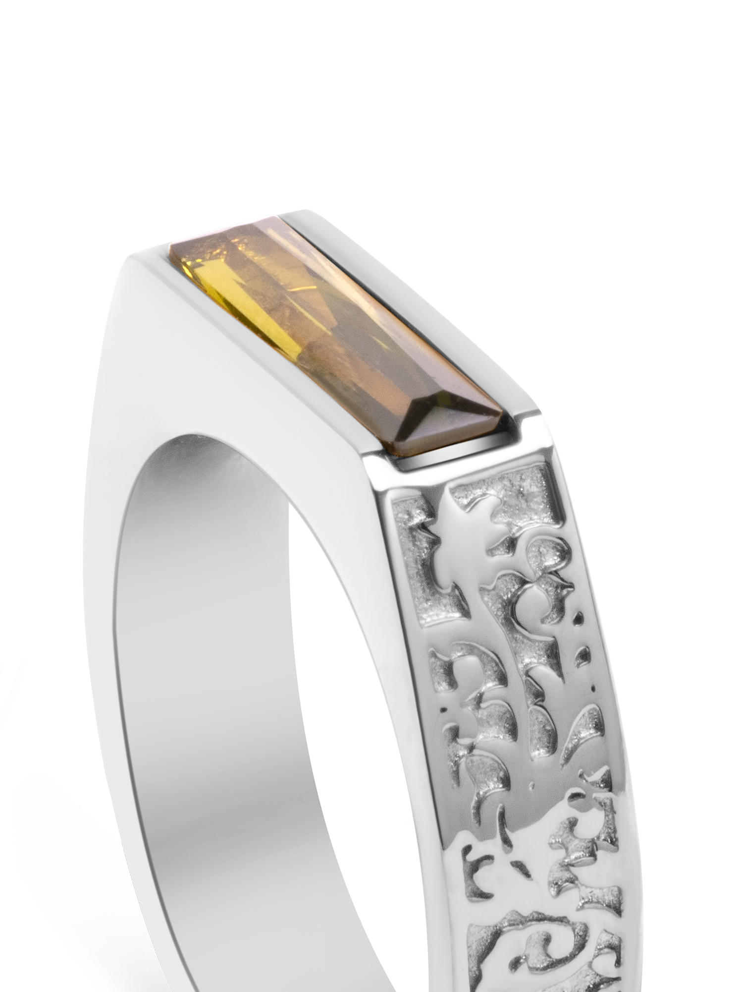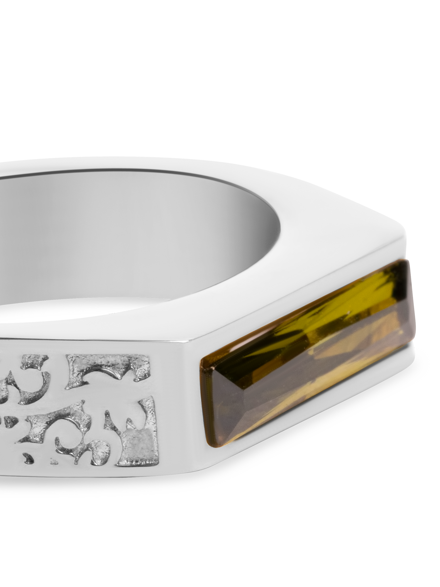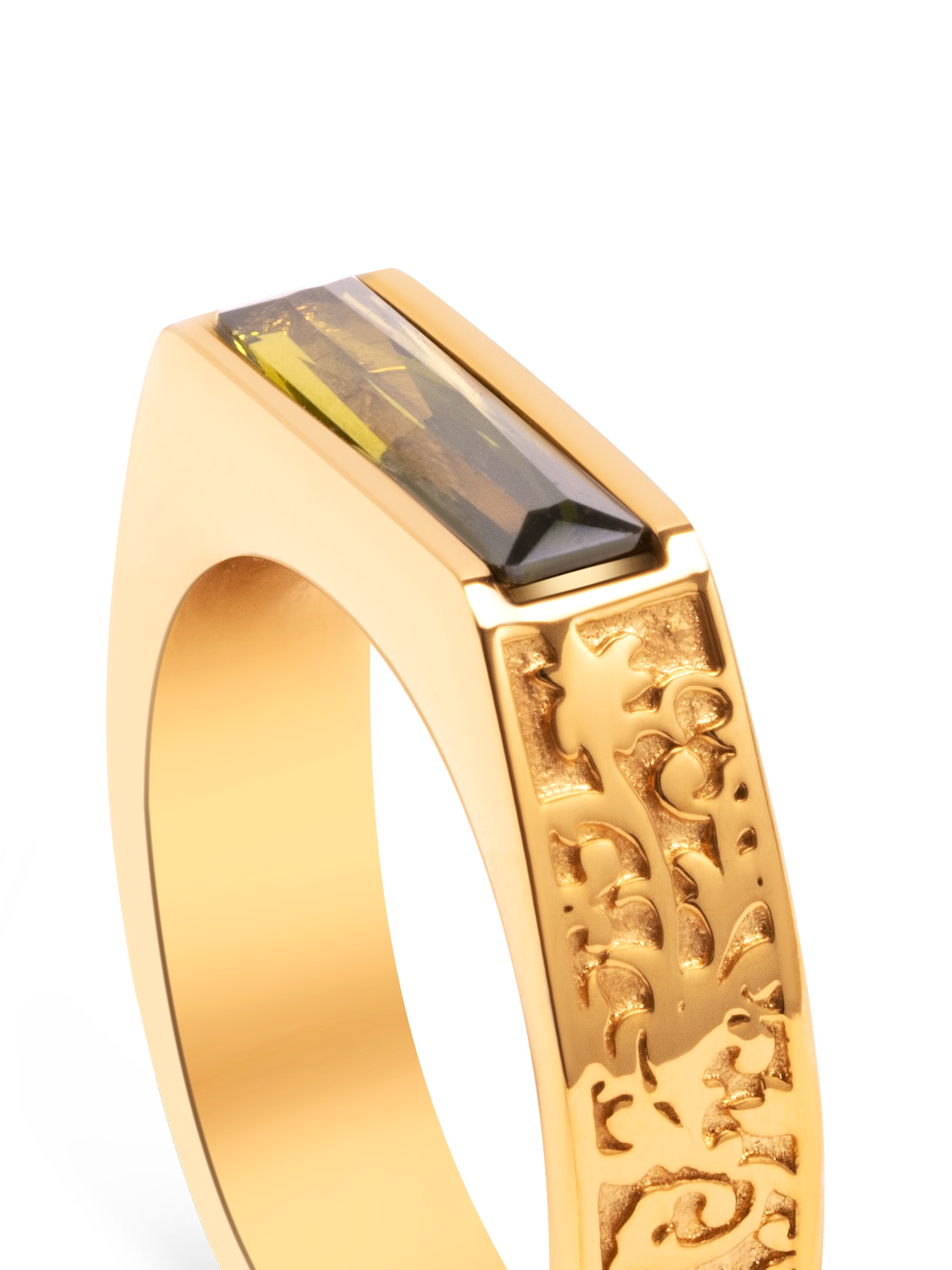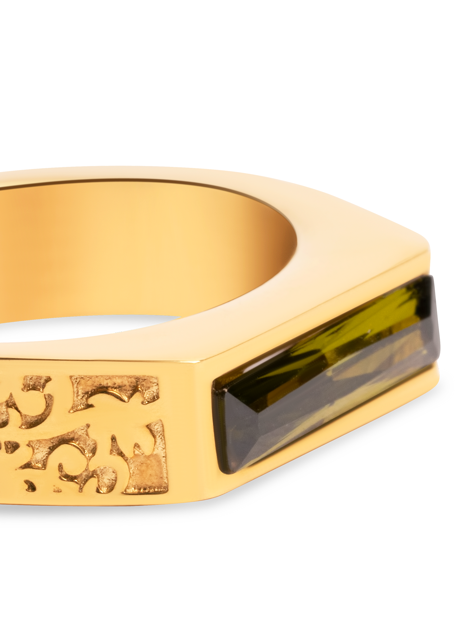 Inspired by Gothic architecture & heritage. A baguette cut green crystal is encased inside of an intentionally “unfinished” face, designed to remind it’s wearer of the continuous and perpetual personal growth they must pursue.